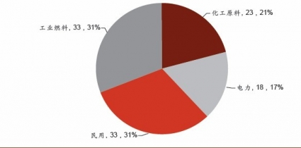 2、“十二五”期間天然氣對煤炭的替代約占煤炭需求增量的35%。《2012-2016年中國天然氣市場供需預測與投資前景評估報告》內容顯示:2000-2010 年間中國天然氣消費年均增速15.9%,顯著高于1990-2000 期間的4.9%。2011 年中國天然氣消費量達到1205 億立方米,占一次能源消費總量的4.6%,國家規劃“十二五”末天然氣消費達到2300 億立方米,占一次能源消費總量的比重上升至7.5%,意味著2012-2015年年均增速將達到17.5%。由于天然氣需求增量主要來自發電、工業燃料和城市燃氣等,將產生對動力煤需求的替代。假設天然氣全部替代煤炭,按照天然氣平均熱值8500 大卡/立方米測算,到2015 年新增天然氣將直接或間接替代動力煤需求2.8 億噸,即年均替代0.7 億噸,雖然占中國煤炭需求總量的份額很少(不足2%),但相對每年煤炭需求的增量(無天然氣替代的情況下約2 億噸)來說,仍是一個不可忽視的威脅。