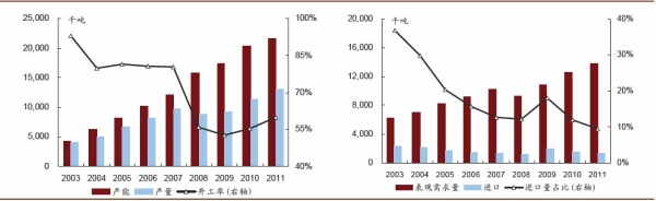 我國PVC產(chǎn)能明顯過剩(左圖);我國PVC進(jìn)口量占比較低(右圖)