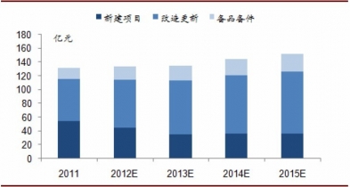 2、我國洗選廠技術水平參差,升級更換需求較快增長。2010年末我國1800座煤炭洗選廠中,大型煤礦企業選煤廠近600座,地方煤礦選煤廠200余座,鄉鎮民營選煤廠約1000座,規模和技術水平均有較大差別。中企顧問網發布的《2012-2016年中國煤炭工業市場全景調查與投資方向研究報告》指出:早期建成的洗選煤廠采用相對落后的洗選工藝和設備,環保問題突出,亟需進行改造。另一方面,大部分洗選設備設計壽命8-10年,但國產設備的更新周期基本在5年左右。因此06-10年投入使用的設備已經進入更新周期。12年開始更新需求將超過新增需求,未來每年復合增速在12%左右。