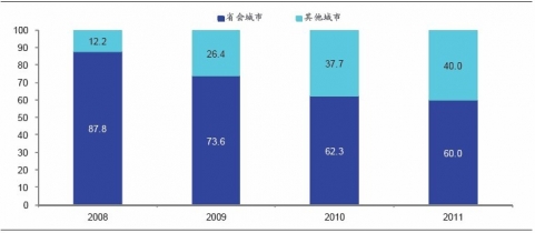 2.消費區域由一線及省會城市向下擴散,近三年非省會城市高端女裝零售額占比持續提升。2008年,高端女裝消費額的87.8%集中在省會城市,而2011年,省會城市零售額占比降低至60.05%。
