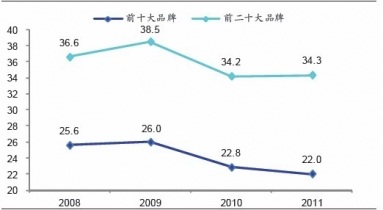 縱向看,高端女裝前十大品牌市場占有率從2008年的25.6%小幅提升至26%以后,逐步下降至2011年的22%,前二十大品牌市場占有率從2009年的38.5%下降至2011年的34.4%。
