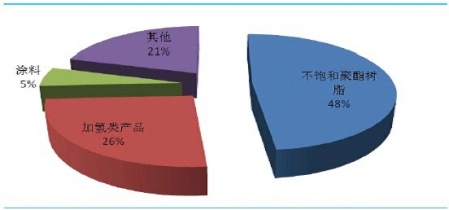 不飽和聚酯樹(shù)脂(UPR)是熱固型樹(shù)脂的主要品種之一,由于其優(yōu)良的機(jī)械性能、電性能和耐化學(xué)腐蝕性能,且加工工藝簡(jiǎn)便,因此應(yīng)用廣泛。目前中國(guó)可以生產(chǎn)400余個(gè)牌號(hào)的UPR,主要品種包括鄰苯型、間苯型、對(duì)苯型、雙酚A型等,按用途和功能分類包括通用樹(shù)脂、耐化學(xué)品樹(shù)脂、阻燃樹(shù)脂、澆注樹(shù)脂、柔性樹(shù)脂、人造大理石、BMC與DMC樹(shù)脂、裝飾類樹(shù)脂和特種樹(shù)脂等。中企顧問(wèn)網(wǎng)統(tǒng)計(jì)顯示:中國(guó)的UPR市場(chǎng)中,增強(qiáng)類(玻璃鋼用)樹(shù)脂比例只占40%,而用于非增強(qiáng)類樹(shù)脂的比例高達(dá)60%,在非增強(qiáng)類樹(shù)脂中工藝樹(shù)脂占34%,紐扣樹(shù)脂占24%,人造大理石占19%。