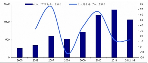 2005-2012年9月三星電機(jī)MLCC銷售收入及增長率情況