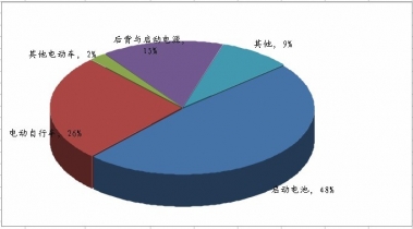 鉛酸蓄電池適用范圍很廣,主要可用作汽車起動(dòng)電池、電動(dòng)車動(dòng)力電池、后備電源以及儲(chǔ)能電源等,下游應(yīng)用行業(yè)包括交通運(yùn)輸、通訊、電力、鐵路、礦山、國(guó)防等。《2012-2016年中國(guó)鉛酸蓄電池行業(yè)深度調(diào)研與發(fā)展趨勢(shì)研究報(bào)告》指出汽車起動(dòng)領(lǐng)域是鉛酸蓄電池的第一大應(yīng)用領(lǐng)域,約占鉛酸蓄電池消費(fèi)量的50%左右。