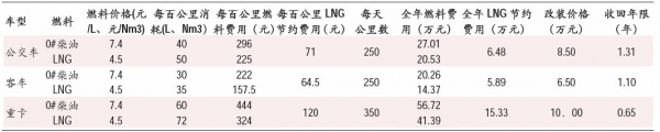 《2012-2016年中國(guó)綠色汽車市場(chǎng)評(píng)估與投資方向研究報(bào)告》指出:選擇LNG汽車主要的運(yùn)用領(lǐng)域(包括公交車、客車、重卡),綜合考慮改裝成本與燃料成本進(jìn)行分析,可以看到購(gòu)置LNG 汽車帶來的初次購(gòu)置成本增加在一年半之內(nèi)均能回收。并且對(duì)于平均運(yùn)輸里程最長(zhǎng)的重卡而言,回收期只需不到一年。回收期后,每年可節(jié)約燃料成本超過15 萬元,經(jīng)濟(jì)性極其突出。