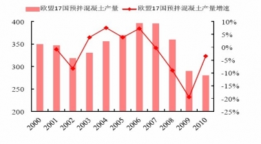 2000-2010年歐盟17國預(yù)拌混凝土產(chǎn)量變化情況:百萬方