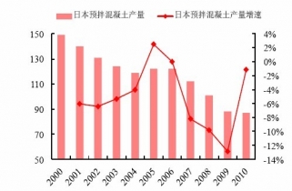 2000-2010年日本預(yù)拌混凝土產(chǎn)量變化情況:百萬方