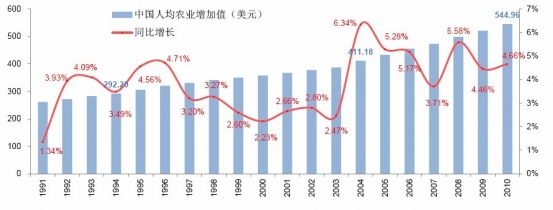 1991-2011年中國人均農(nóng)業(yè)增加值的增長情況