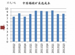 中國自產錫精礦成本大約在8-9萬元/噸左右,錫錠成本大約10-11萬元/噸左右。2012年國內錫價最低觸及12.3萬元/噸便遇到支撐。