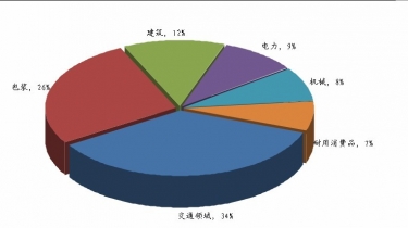 據美國統計局公布的數據,2012年美國境內原生鋁產量為200萬噸,總價值為43.2億美元。此外年度回收量為160萬噸。美國國內的鋁消費主要集中在交通領域,占比為34%,其次是包裝領域,占比為26%。