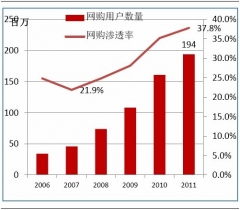 其一、網(wǎng)民普及率增加迅速。2011年,網(wǎng)購用戶數(shù)量達(dá)1.94億,占網(wǎng)民比重達(dá)37.8%,而2007年還僅21.9%;服裝網(wǎng)購規(guī)模在2011年達(dá)2049億,5年CAGR達(dá)到66.7%,在網(wǎng)購規(guī)模中,服裝品類占比達(dá)14.3%;而服裝的銷售中,網(wǎng)購規(guī)模已經(jīng)占到零售的26.5%,這說明服裝網(wǎng)購已經(jīng)占據(jù)了零售市場的重要一極,在2012年,這幾個比率上升得更快。