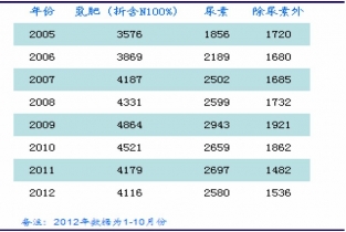低含N氮肥的產(chǎn)量有減少的趨勢,這有利于尿素的需求,這一點是市場所忽視的。由于低含N氮肥的附加值低,制約著在市場上流通,加上不像尿素還有工業(yè)方面的需求,低N肥有逐漸被尿素搶占市場空間,這也是推動近幾年尿素需求提升的一個重要的因素。2005年碳銨產(chǎn)量為5600萬噸,而預(yù)計2012年碳銨產(chǎn)量將銳減至2100萬噸,折算成同等養(yǎng)分的尿素,則相當(dāng)于增加了尿素需求近1300萬噸。