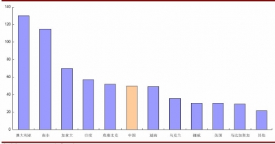 2011年世界各國鈦精礦(以金紅石計算)產(chǎn)量(萬噸)