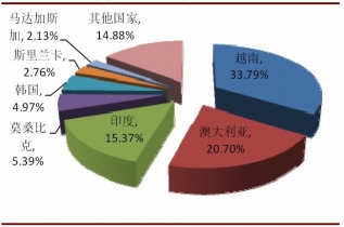 中國每年需要從國外進(jìn)口大量的鈦精礦。2011年中國進(jìn)口鈦礦達(dá)227萬噸,同比增長11.3%。預(yù)計2011年中國需求鈦精礦500萬噸以上,進(jìn)口依賴度達(dá)44%左右。尤其是從越南、印度、澳大利亞等地區(qū)進(jìn)口的數(shù)量較多,越南礦占我國進(jìn)口總量的34%、印度礦占15%、澳洲礦占20.7%。相比較2010年從三個國家進(jìn)口(越南42%、印度21%、澳洲18%)相比,從越南進(jìn)口占比有所下降,主要因?yàn)?011年5月底越南政府出臺了限制向中國出口鈦礦的政策。越南政府之所以限制出口鈦礦,主因?yàn)樵侥弦恢背隹阝伒V,但需要進(jìn)口鈦白粉等高附加值產(chǎn)品,越南政府希望國內(nèi)企業(yè)發(fā)展鈦精礦深加工工業(yè)。