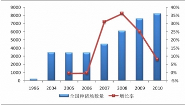 我國種豬行業(yè)起步較晚,1996年我國種豬場(chǎng)數(shù)量僅有190家,2000年以后逐漸發(fā)展起來,2004年我國種豬場(chǎng)數(shù)量為3449家,06年以后隨著大企業(yè)逐漸對(duì)種豬的重視,種豬行業(yè)進(jìn)入一個(gè)快速發(fā)展期,到2010年種豬場(chǎng)發(fā)展到8223家,每年增加約一千家。