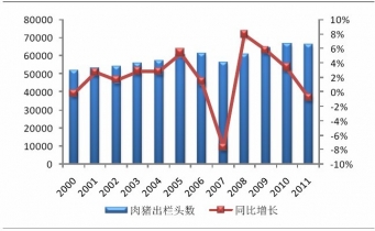 2000-2011年我國肉豬出欄頭數(shù)及增速統(tǒng)計(jì):萬頭