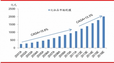 2011年我國化妝品銷售額超過1000億元,約占全球市場的6.8%,僅次于美國、日本和巴西,位居全球第四。2001-2011年我國化妝品市場規(guī)模復(fù)合年均增長率高達(dá)15.8%,位居全球第一。過去十年普及型消費(fèi)是化妝品行業(yè)的主要動力,未來十年消費(fèi)升級將成為化妝品市場增長的新動力。據(jù)預(yù)測,未來5年我國化妝品銷售額將呈現(xiàn)持續(xù)增長的態(tài)勢,至2016年將達(dá)到約2022億元,2012-2016年我國日化行業(yè)仍將保持13.3%的年均復(fù)合增長率。