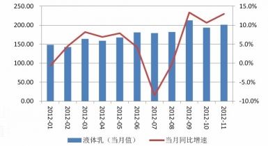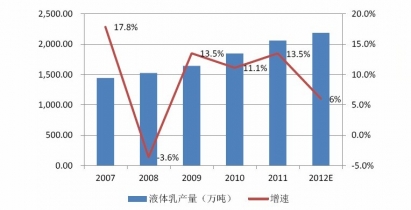 2012年我國液態(tài)奶產(chǎn)量及增速(單位:萬噸)