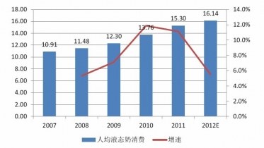 業(yè)內(nèi)預(yù)計預(yù)測2012年全國液態(tài)奶產(chǎn)量增速6%左右,由于液態(tài)奶保質(zhì)期較短,以產(chǎn)定銷比例較大,這里我們暫且用產(chǎn)量表示銷量,即2012年我國液態(tài)奶銷量達(dá)到2184.44萬噸,假設(shè)12年我國人口常規(guī)性增長0.5%,即全國13.5億人口計算,人均液態(tài)奶消費16.14千克.
