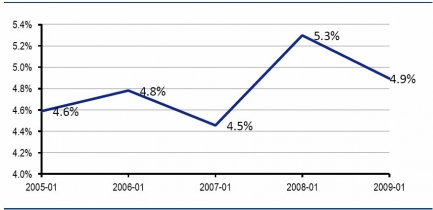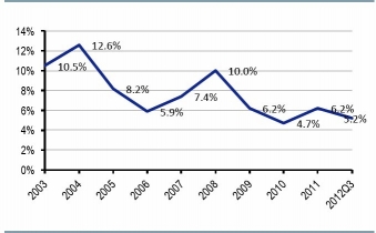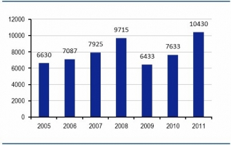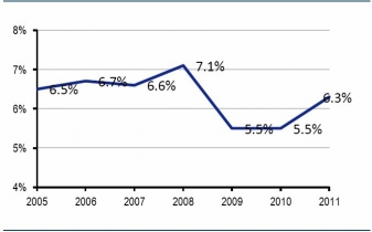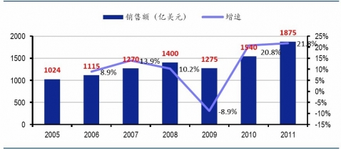 2005-2011年全球輪胎行業(yè)銷售收入變化趨勢(shì)