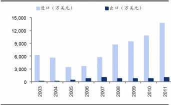 2003-2011年我國(guó)動(dòng)物疫苗進(jìn)口出口額(萬美元)