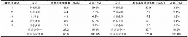 動(dòng)物疫苗、獸藥行業(yè)前五家銷售額(億元,%)
