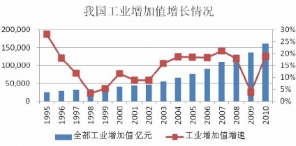變頻器應用于多個工業領域,受工業發展和景氣程度的影響極大。近年來,我國工業增加值較快增長,除去受金融危機影響增速減緩,降到5%以下,其他年份增速保持在20%左右。工業整體的增長拉動了電機需求的增長,同時也帶動了變頻器行業的增長。