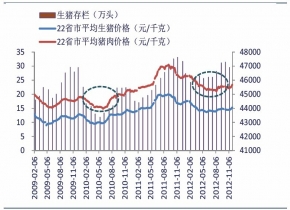 豬價(jià)周期性波動(dòng),預(yù)計(jì)春節(jié)后將回落。當(dāng)前能繁母豬及生豬存欄量都處于歷史相對較高的位置,短時(shí)間內(nèi)我國將保持充足的豬肉供給。從歷史數(shù)據(jù)來看,在生豬存欄量達(dá)到波峰后豬肉價(jià)格在至少半年的時(shí)間內(nèi)保持著下降趨勢,本輪存欄量的高位也將使豬肉價(jià)格在2013年上半年持續(xù)下行。我們預(yù)計(jì)豬肉價(jià)格將在2013年二二季度達(dá)到低點(diǎn),短期來看雖然受到春節(jié)旺銷和雞肉事件影響致豬肉價(jià)格上漲,但豬價(jià)的短期反彈不代表長期的反轉(zhuǎn),預(yù)計(jì)春節(jié)后豬肉價(jià)格將會回落。