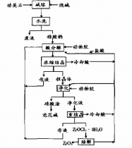 該法具體而言是將鋯英石和燒堿在650-750℃下熔合,使鋯英石轉(zhuǎn)化為可溶于酸的Na2ZrO3和溶于水的Na2SiO3。過程可有下列兩個反應(yīng)式: