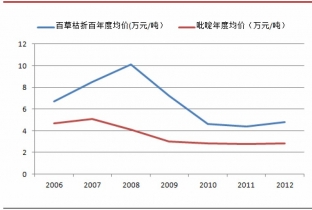 從長(zhǎng)期的百草枯價(jià)格走勢(shì)來(lái)看,過去7年百草枯價(jià)格也經(jīng)歷了巨大的波動(dòng)。2008年百草枯折百均價(jià)達(dá)到10萬(wàn)元/噸,而從09年開始,由于產(chǎn)能大幅擴(kuò)張,百草枯價(jià)格劇烈下跌,經(jīng)歷超過三年的低迷后,從2012年第四季度開始出現(xiàn)了回升的跡象。