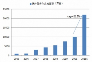 根據(jù)《保護(hù)性耕作工程建設(shè)規(guī)劃》設(shè)定的推廣目標(biāo),到“十二五”末期新增保護(hù)性耕作面積1.9億畝(12.7百萬(wàn)公頃)。預(yù)計(jì)占國(guó)內(nèi)耕地總面積的比例將從09年的3%上升到12%,年均增長(zhǎng)21.5%。