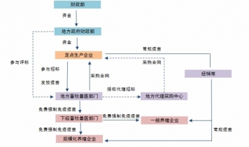 國家強制免疫疫病疫苗(生物制品)由“農(nóng)業(yè)部指定的企業(yè)生產(chǎn),依法實行政府采購,省級人民政府獸醫(yī)行政管理部門組織分發(fā)”,疫苗采購“經(jīng)費由中央財政和省級財政共同按比例分擔(dān)”;“部分符合條件養(yǎng)殖場2可以向農(nóng)業(yè)部指定的生產(chǎn)企業(yè)采購自用的國家強制免疫用生物制品”(農(nóng)業(yè)部《獸用生物制品經(jīng)營管理辦法》,2007年2月),定點生產(chǎn)企業(yè)只能將國家強制免疫用疫苗銷售給省級人民政府獸醫(yī)行政管理部門和符合養(yǎng)殖場,不得向其他單位和個人銷售。非國家強制免疫用疫苗(生物制品)生產(chǎn)企業(yè)可以將本企業(yè)生產(chǎn)的疫苗“直接銷售給使用者,也可以委托經(jīng)銷商銷售”。
