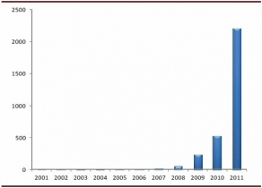 2001-2011年德國年新增光伏裝機(jī)容量(MW)