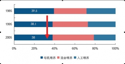 上個(gè)世紀(jì)50-60年代,我國(guó)0-6個(gè)月嬰兒純母乳喂養(yǎng)率至少有80%以上,而根據(jù)目前我國(guó)衛(wèi)生部統(tǒng)計(jì)的數(shù)據(jù),當(dāng)前我國(guó)出生后6個(gè)月內(nèi)的嬰兒純母乳喂養(yǎng)率4不足30%(母乳喂養(yǎng)率大約是67%左右)。這個(gè)數(shù)字顯著低于《中國(guó)兒童發(fā)展綱要(2001—2010)》確定的50%的目標(biāo)。不僅我們國(guó)家,大部分國(guó)家的母乳喂養(yǎng)率都隨著國(guó)家經(jīng)濟(jì)發(fā)展水平的提升而下降。