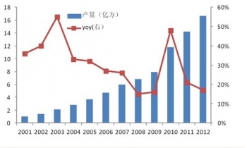本文導(dǎo)讀:2012年中國預(yù)拌混凝土的產(chǎn)量為16.63億方,同比增長17%,過去十年的復(fù)合增長率為27%。