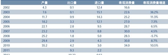 2002-2012年丁酮產(chǎn)銷及進(jìn)出口統(tǒng)計(jì)單位:萬噸