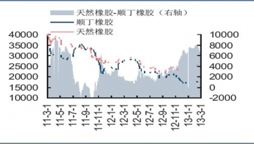 011-2013年天然橡膠與丁苯橡膠價(jià)差走勢(shì)(元/噸)