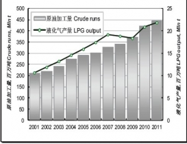 LPG供給跟隨原油加工量持續(xù)增長。國內(nèi)LPG主要來自于煉油二次加工的催化裂化或蒸汽裂解副產(chǎn),其產(chǎn)量增長隨著原油加工量增長。2001-2011年,我國原油加工量從2.11億噸/年增長到4.46億噸/年,CAGR7.7%。LPG產(chǎn)量從1611萬噸/年增長到2188萬噸/年,CAGR7.4%。