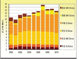 國內(nèi)LPG民用及化工需求均不量氣。LPG在民用領(lǐng)域主要用于燃?xì)猓陙硎艿教烊粴獾奶娲^明顯。LPG在民用領(lǐng)域的消費(fèi)量2005年為1640萬噸,占總量的73.8%。2010年為1683萬噸,占總量的72%。從2007年開始,LPG作為城市燃?xì)獾南M(fèi)量呈下降趨勢。而LPG化工需求受到2012年11月出臺的消費(fèi)稅政策負(fù)而影響。
