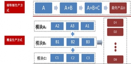 精益生產(chǎn)將整個(gè)生產(chǎn)環(huán)節(jié)拆分,模塊之間技術(shù)關(guān)系被相對(duì)固定下來(lái),但模塊內(nèi)部可以存在多種變化,以變化組合形式的多樣性來(lái)滿足需求的多樣化。生產(chǎn)通過(guò)快速調(diào)整模塊之間的變化組合來(lái)應(yīng)對(duì)市場(chǎng)產(chǎn)品需求結(jié)構(gòu)的變化。由于模塊之間的技術(shù)關(guān)系相對(duì)固定,模塊組件之間的組裝可以實(shí)現(xiàn)較高程度的標(biāo)準(zhǔn)化和規(guī)模經(jīng)濟(jì)。同時(shí),單個(gè)模塊的角色可以由一個(gè)或多個(gè)企業(yè)承擔(dān),模塊中的單一組件仍然可以實(shí)現(xiàn)規(guī)模化生產(chǎn)。