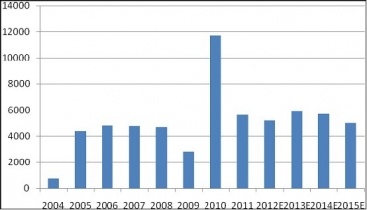2004-2015年全球乙烯新增投放情況(千噸)