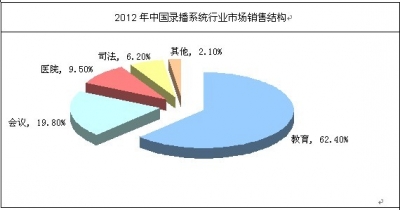 2012年我國(guó)錄播系統(tǒng)產(chǎn)品主要應(yīng)用在教育領(lǐng)域、辦公會(huì)議和醫(yī)院等下游行業(yè),2012年我國(guó)錄播系統(tǒng)產(chǎn)品消費(fèi)結(jié)構(gòu)圖如下圖所示: