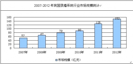 本文導(dǎo)讀:2012年我國(guó)錄播系統(tǒng)行業(yè)市場(chǎng)規(guī)模約152億元,同比2011年的125億元增長(zhǎng)了21.6%。