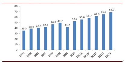 2003-2015年全球繼電器市場銷售額:億美元