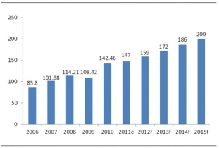 2006-2015年中國繼電器市場銷售額(億元)