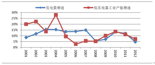 2001-2012年發(fā)電量增速與低壓電器行業(yè)增速關(guān)系