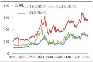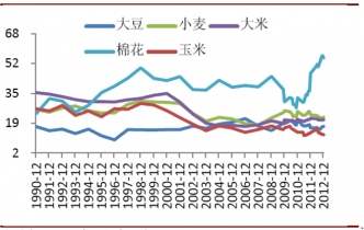從庫存消費比看,除棉花外,主要農產品當前庫存與消費比均處于過去20年來較低的水平。其中,2012年末大豆庫存占消費比重僅為16.73%,玉米僅為12.1%,小麥僅為21.88%,大米僅為20.47%。棉花庫存消費比較高,達到54.87%,主要是受中國大量收儲的影響,不考慮中國,世界其它地區庫存消費比也處于較低水平。較低的庫存水平限制了農產品價格回調的幅度,預計2013年全球農產品價格和種植收益仍將保持高位運行。