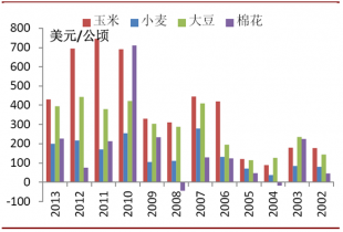 雖然受庫存意外升高等因素影響,近期大宗農產品期貨價格出現回調,然而當前價格仍處于本輪周期的高位水平,美國農民種植收益依然屬于近幾年高位水平。