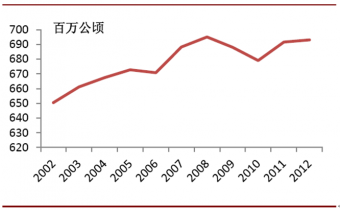 2002-2012年全球農產品播種面積穩定增長