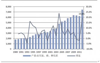 1989-2012年全國(guó)化肥產(chǎn)量及增速情況:萬(wàn)噸
